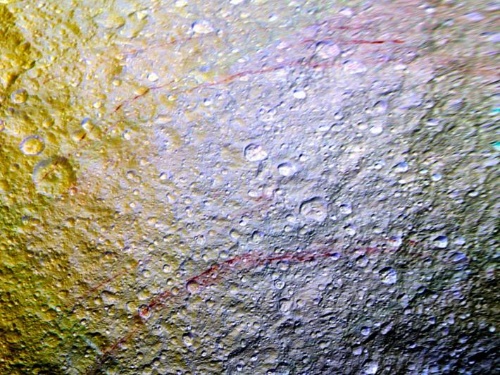 土星探査機カッシーニのカメラが撮影した土星の衛星テティス。謎の赤い筋が何本も走っている。長さ数百キロに及ぶものもあるが、なぜ赤く、何でできているかなど、その正体は解明されていない。