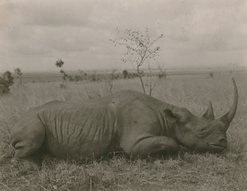 1909年の『ナショナル ジオグラフィック』誌で、退任したばかりのセオドア・ルーズベルト元米国大統領がアフリカに狩り行っているようだという記事に掲載された写真。ケニアで撃たれたサイが倒れている。(PHOTOGRAPH BY CARL E. AKELEY, NATIONAL GEOGRAPHIC CREATIVE)(参考記事:「T・ルーズベルト、消えゆくライオン」)