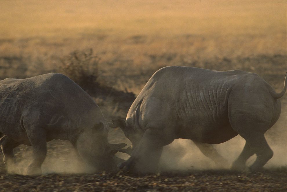 ケニアのマサイマラ国立保護区で戦う、絶滅危惧IA類のクロサイ。2008年撮影。ケニアではここ数年、密猟により多数のサイが命を落としている。(PHOTOGRAPH BY GERRY ELLIS, MINDEN PICTURES)