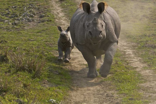 仲間の後を追うインドサイ。2007年、インドのカジランガ国立公園にて撮影。(PHOTOGRAPH BY STEVE WINTER, NATIONAL GEOGRAPHIC CREATIVE)