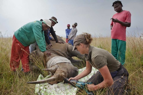 麻酔をかけられたメスのシロサイから角を切除する獣医。南アフリカ北西州にて撮影。(PHOTOGRAPH BY BRENT STIRTON, REPORTAGE FOR WWF/NATIONAL GEOGRAPHIC)