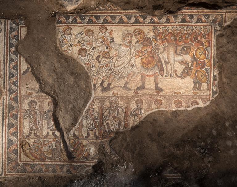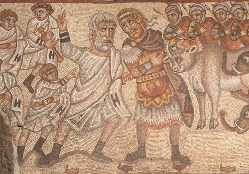モザイク画には武装したゾウも描かれている。このモチーフから連想されるのは、紀元前2世紀半ばにセレウコス朝に対して反乱を起こしたユダヤ人のマカバイ家の物語だ。アレクサンドロス大王の部下の子孫が築いたセレウコス朝は、ゾウを戦争に用いていたことで知られる。
