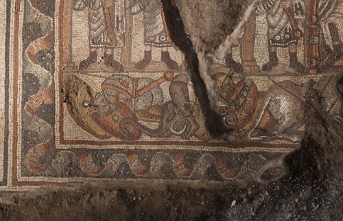 マグネス氏によると、このモザイク画は下から上へ読むようになっているという。最下段には、アレクサンドロス大王が版図を東地中海まで広げる途上で行われた、数々の戦闘の場面が描かれている。