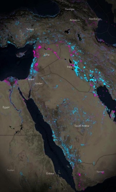 できあがった地図は、4年間で地球上の夜間光がどれほど変化したかを示すこととなった。なかにはわかりやすい大きな違いもある。例えば、上の中東の画像では、内戦で荒廃したシリアが暗くなっている。