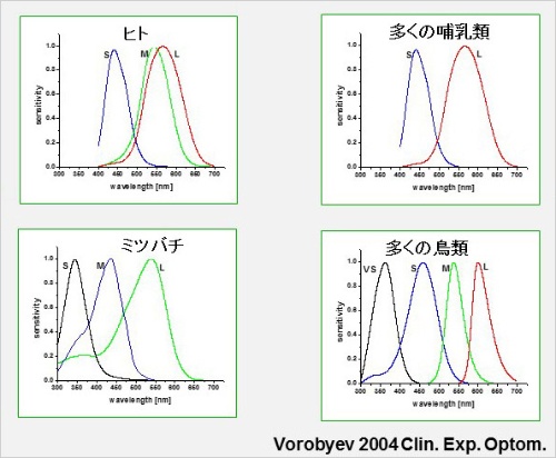 そして、ヒト、多くの哺乳類、ミツバチ、多くの鳥類というカテゴリーで、錐体オプシンの多様性を示す図表を見せてもらった。ミツバチは脊椎動物ではないが、昆虫もやはりオプシンを使ってものを見ている。
