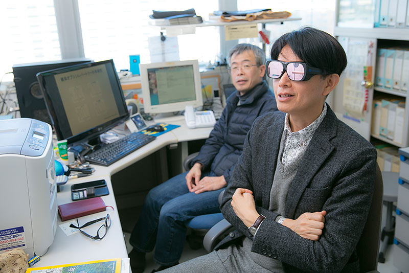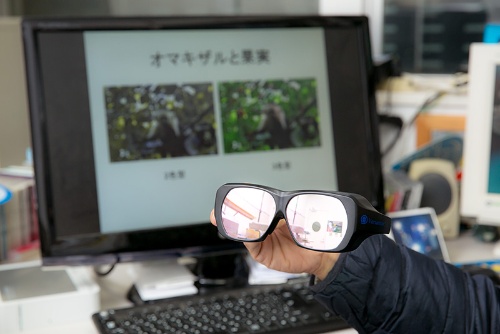 「実は、この2色型というのは、ヒトですといわゆる「赤緑色盲」に相当します。そして、こういうメガネがありまして、僕なんかは、プレゼンで見えにくい色使いをしないように確認するために使っているんですが──」