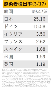 ちょっと不安な言明だ。日本では死後の剖検率が低く、死因の確からしさに疑問が残ることがあるとよく聞く。では、COVID-19についても、日本の「死者数」は正しく報告されているのだろうか。警察が変死として扱った事案で、死後にPCR検査をしたところ、新型コロナウイルスへの感染が判明したケースが4月以降いくつか報告されているし、他にも感染が発覚しないまま亡くなった人がかなりいる可能性も切り捨てられない。もちろん、COVID-19による死亡が実は報告されているものの10倍以上だったということにならないかぎり(さすがにありそうにない)、3月における検出率は欧米よりも高いままなのだが、それでも気になる。
